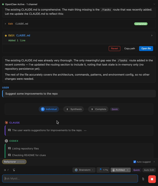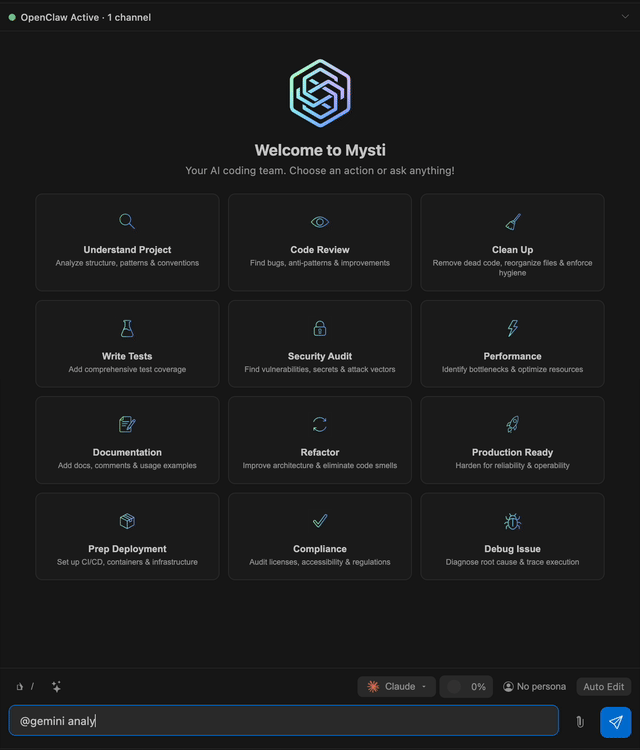 Mysti는 AI에게 단순히 코드를 짜라고 시키지 않는다. 16개의 개발자 페르소나를 부여할 수 있다. Architect, Debugger, Security-Minded, Performance Tuner, Prototyper, Refactorer, Full-Stack, DevOps 등이다. 페르소나를 바꾸면 같은 질문에도 완전히 다른 관점의 답이 나온다.