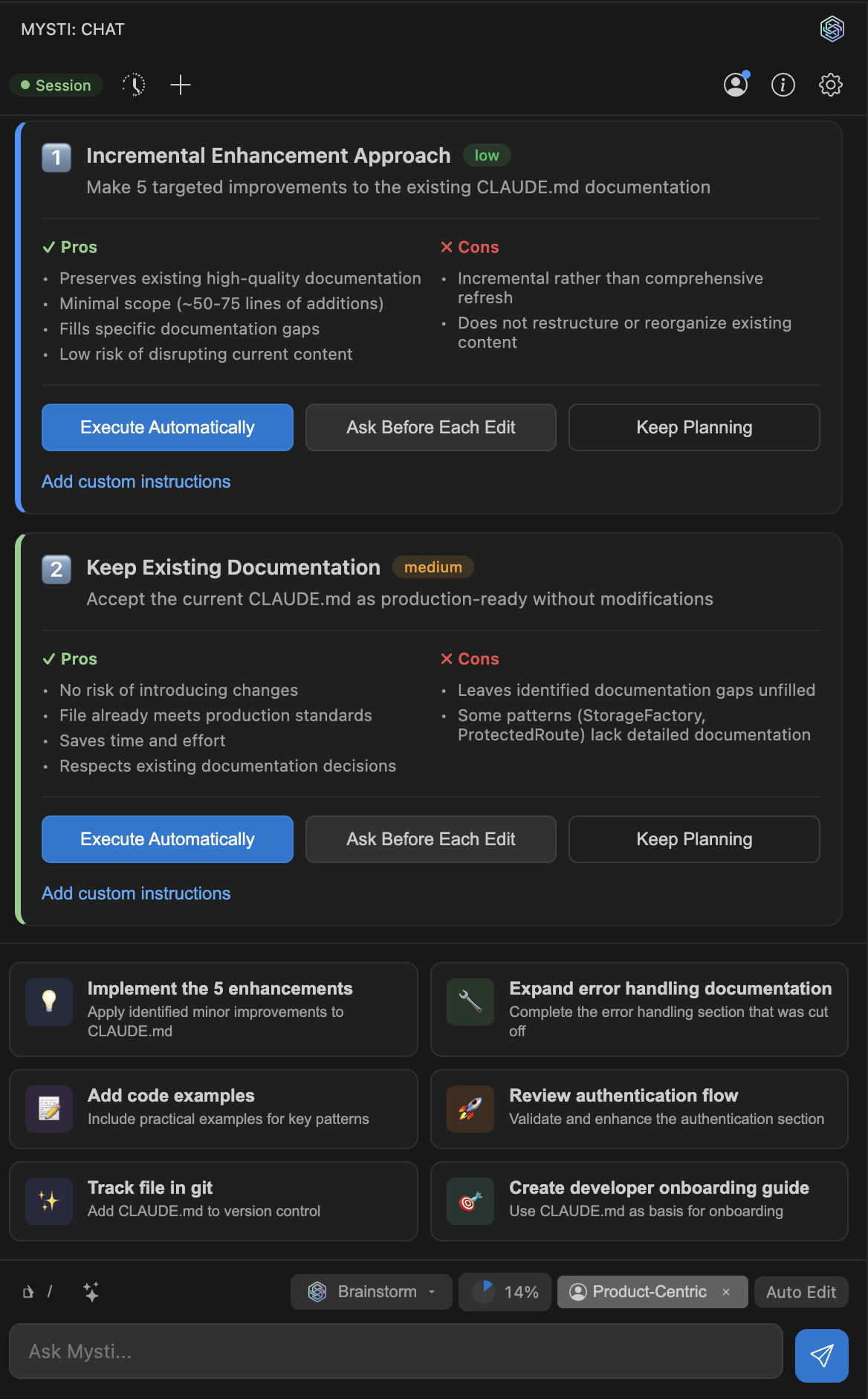이 구조에서 지능형 플랜 감지(Intelligent Plan Detection) 기능도 중요하다. 에이전트가 여러 구현 방식을 제안하면 자동으로 감지해서 사용자에게 선택지를 보여준다. 사람이 최종 결정권을 쥐되, AI가 선택지를 구조화해주는 방식이다.